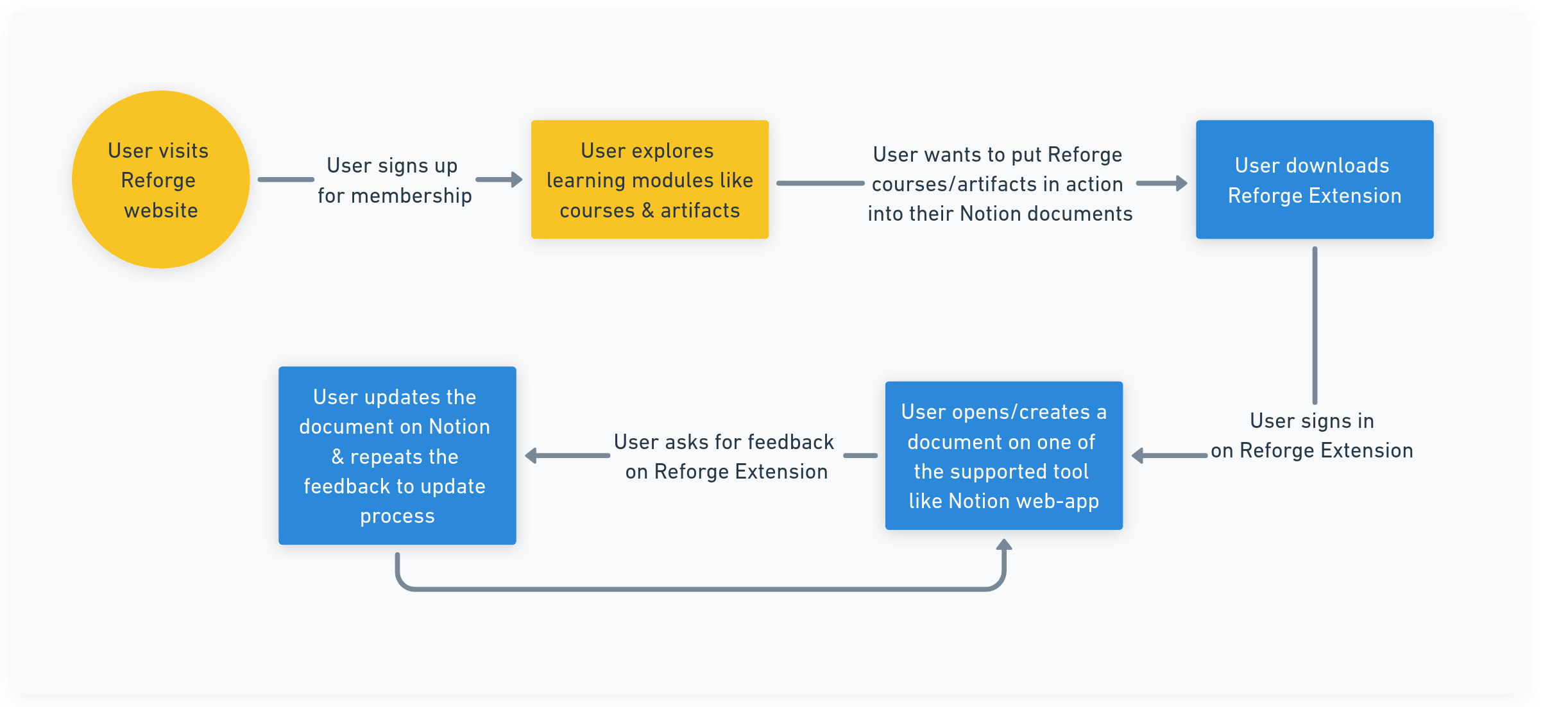 Now, let’s quickly define the user journey for a Reforge member seeking to utilise Reforge content while drafting a critical document on their Notion workspace (same journey can be replicated for other tools like Coda, Google Doc, Confluence, etc.)
